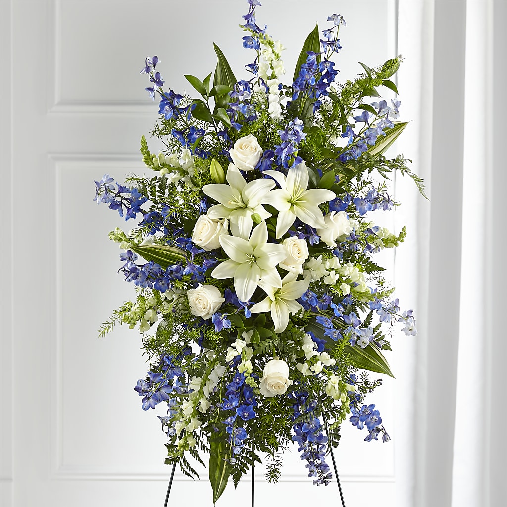 A collection of bold blue flowers shares a tribute that words cannot express. Designed with lilies, roses, delphinium and snapdragons our Faithful Friend Standing Spray is a grand gesture to express kindness and solace to a loved one.